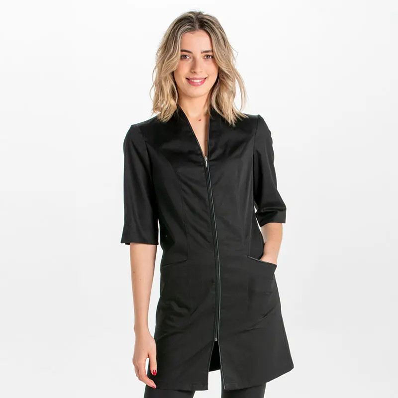 - Elegante bata tipo levita de color negro de mujer.