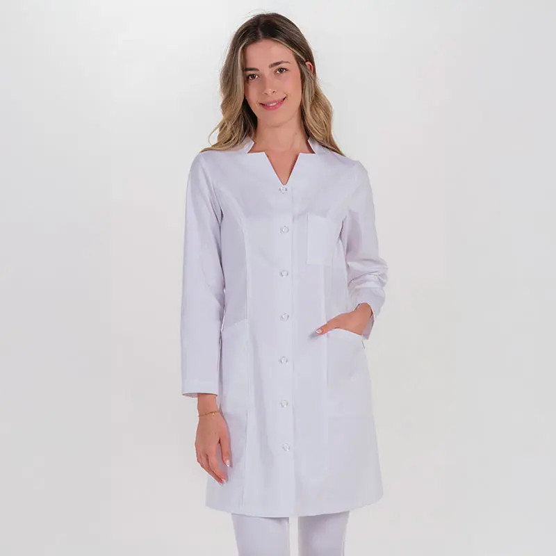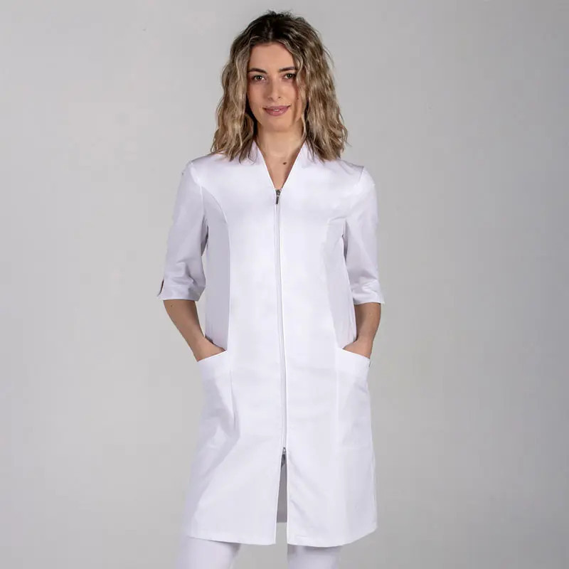 - Bata sanitaria en color blanco con un nuevo y moderno diseño con cierre de cremallera.