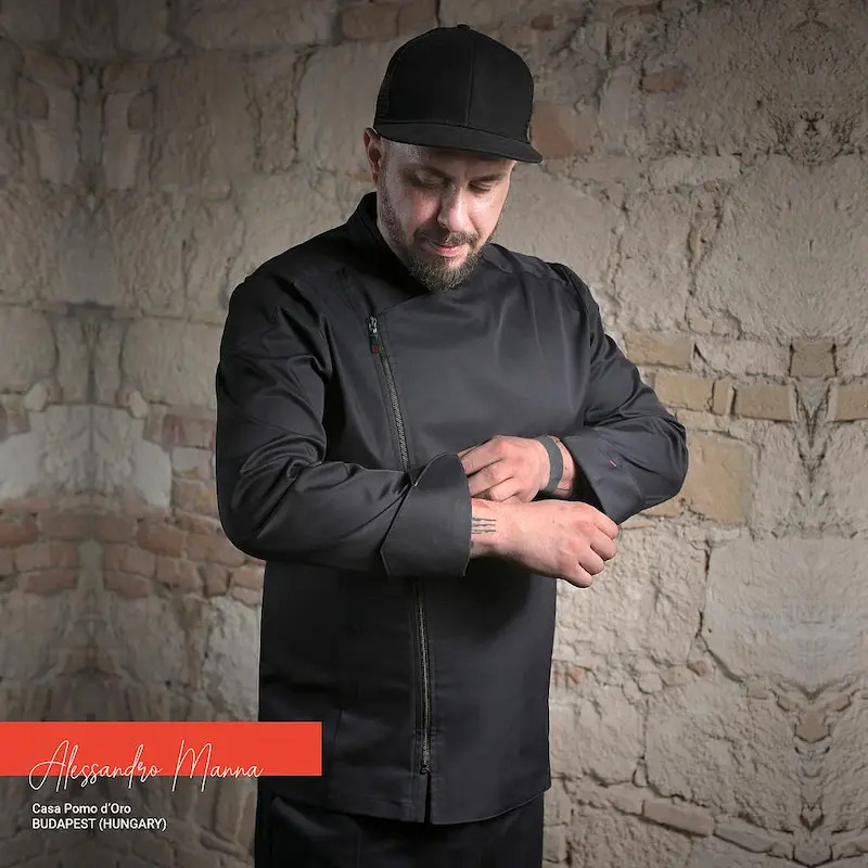 - Elegante chaqueta de cocina unisex de manga larga en color negro.