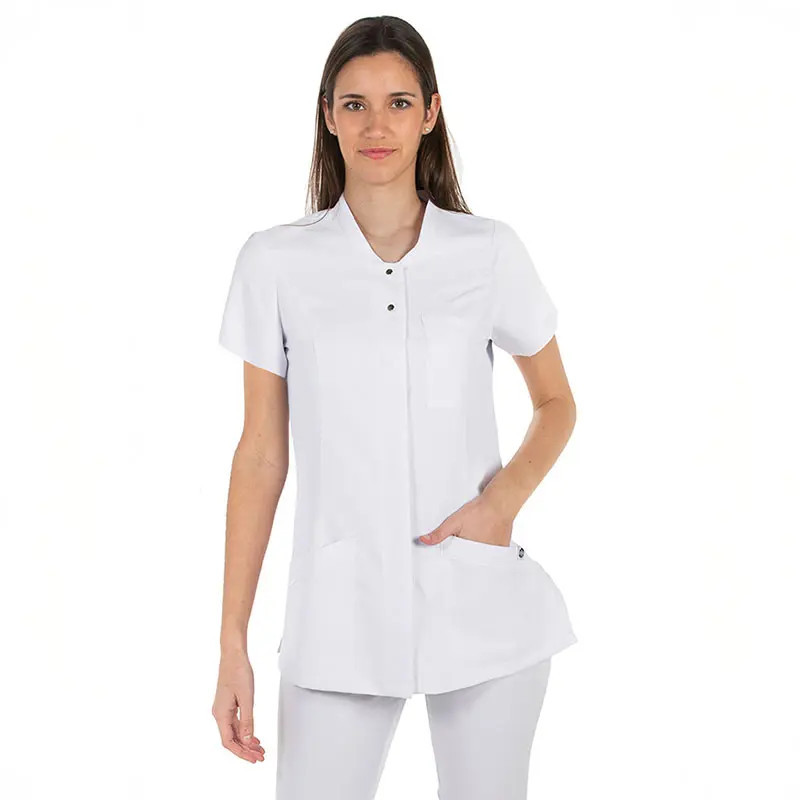 • Cierre de Pastilla y Escote en V: Incorpora un cierre central con botones de pastilla altamente resistentes y un cuello en pico que aporta una estética profesional y despejada.
