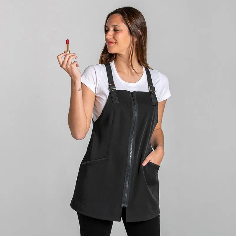 - Elegante pichi corto de trabajo en poliéster negro con fibras elásticas y con tirantes de polipiel.